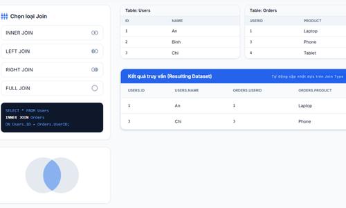 - Joins: chọn loại liên kết và quan sát trực quan cách dữ liệu giữa các bảng được ghép lại.